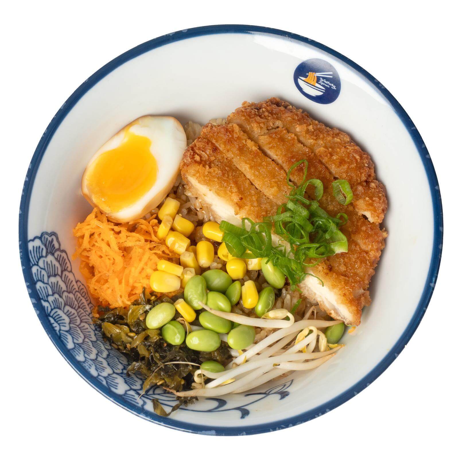 Chicken schnitzel of teriyaki paling, ei, bonen, mais, taugé, geraspte wortel, lente ui.